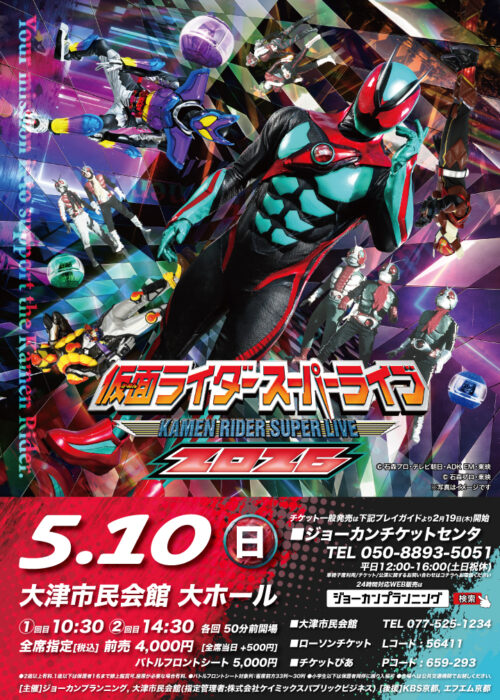 公演情報 弊社主催、共催のチケット購入窓口 は【ジョーカンチケットセンタ】となっております。 Webからも購入可能‼ 仮面ライダースーパーライブ2026滋賀大津公演 日 時 2026年5月10日(日) ①10:30~ ②14:30~ (開場は各公演50分前) 会 場 大津市民会館 大ホール (滋賀県大津市島の関14-1) ※本会場の1列目の表 […] 詳細はこちら 協力公演情報